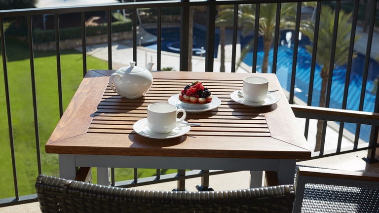• Private balcony overlooking the sea with table and chairs on the lower floor of the Suite.