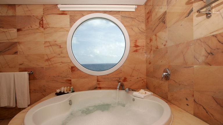 • Spectacular bathroom with a round whirlpool bath for two with rain shower and magnificent sea views, hair dryer.