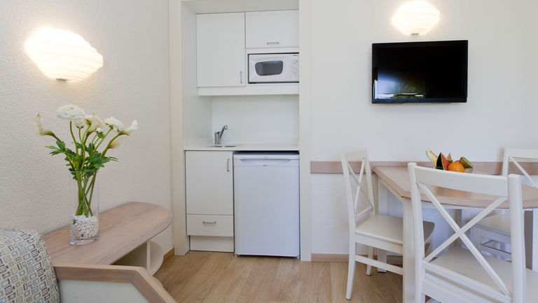 • Kitchenette with microwave and refrigerator, without cooking plates.