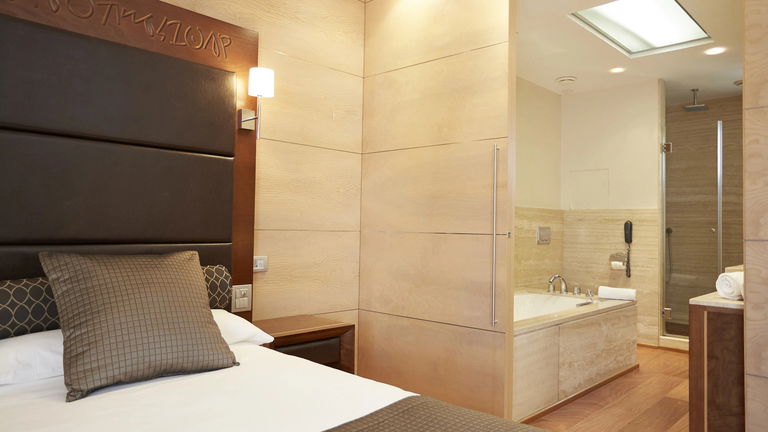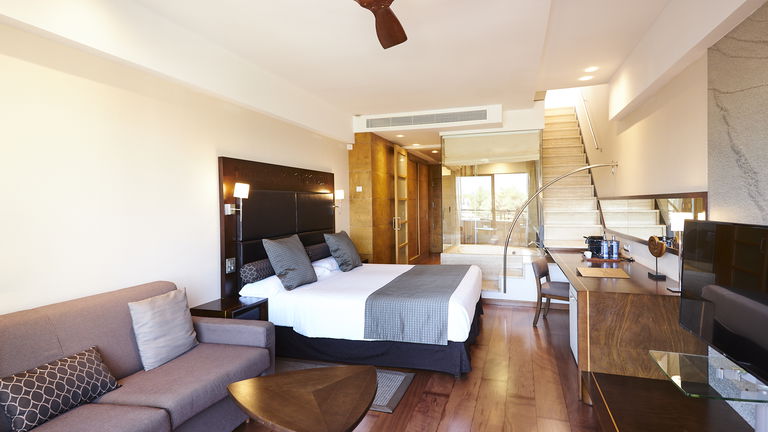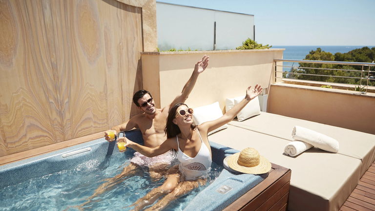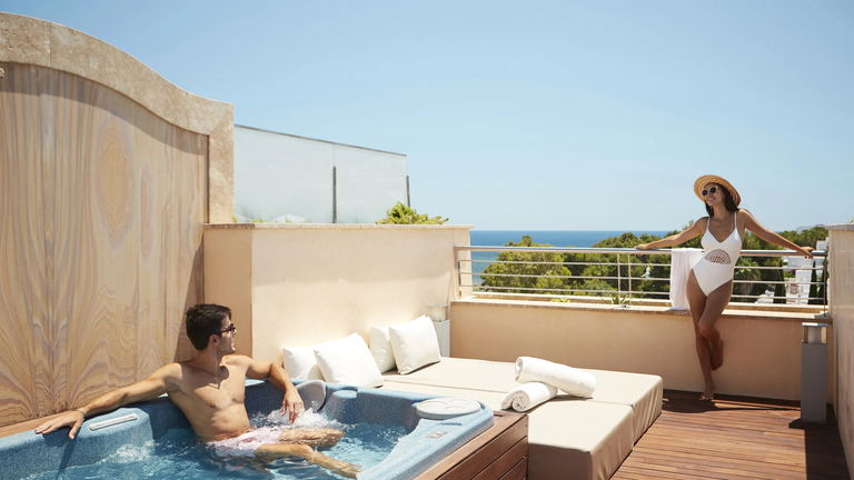 • Private sundeck of 37 m² with mini hydro-massage pool for two people, sofa and parasol.