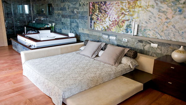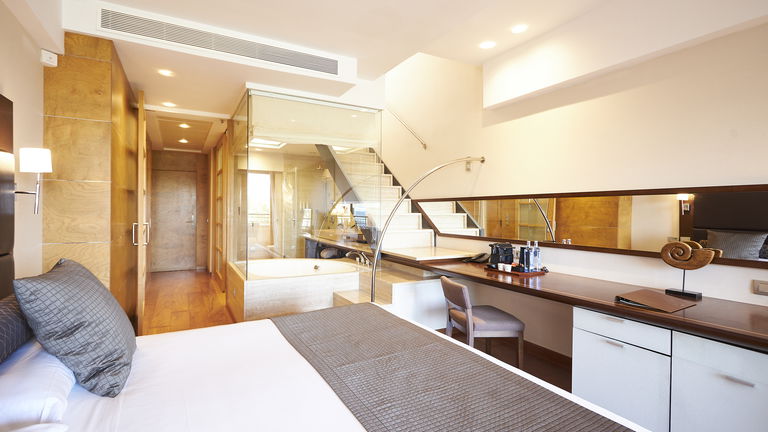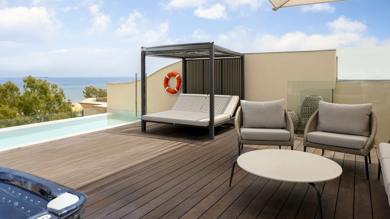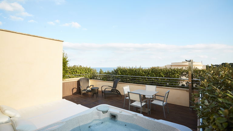 • Very large private terrace with mini hydro-massage pool for two people, outdoor shower, chill-out area with daybed and parasol.