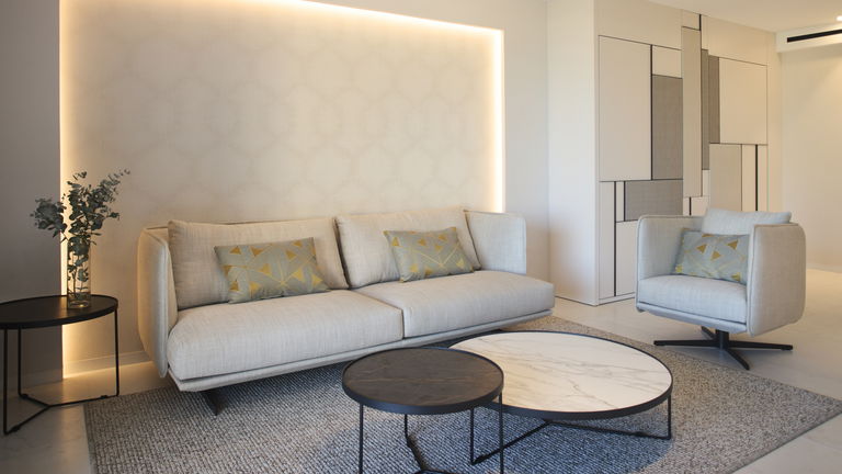 • Spacious living room with, sofa, two 90 x 200 cm wall beds, a 65' flat screen TV.