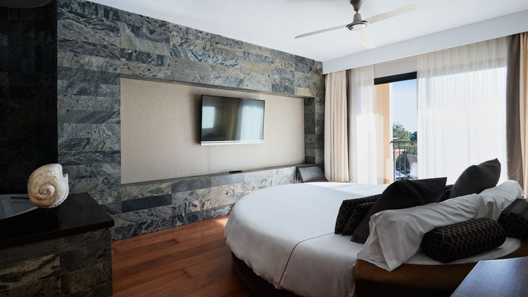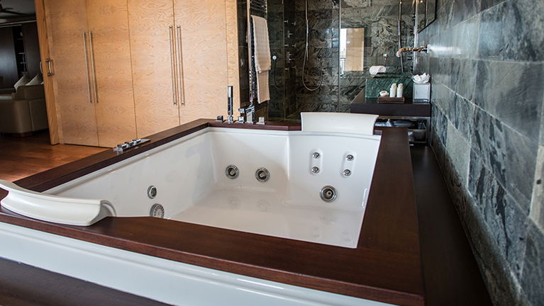 • Private 59 m² solarium with a 15 m² private pool, whirlpool for 4, outdoor shower, chill- out area with Balinese bed shaded lounge area with sofas and minibar with a charge.