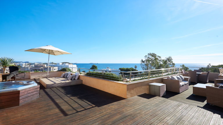 • 26 m² private solarium with magnificent views of the sea, a mini-hydromassage pool for two, outdoor shower, chill-out area with daybed and parasol on the upper floor of the suite.