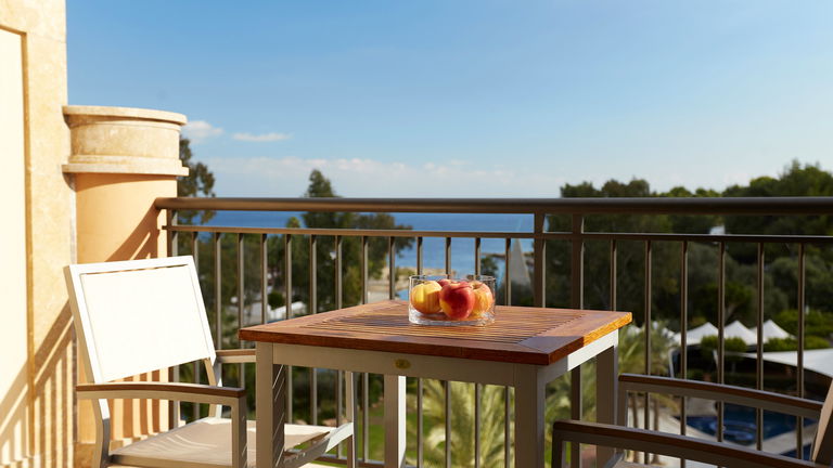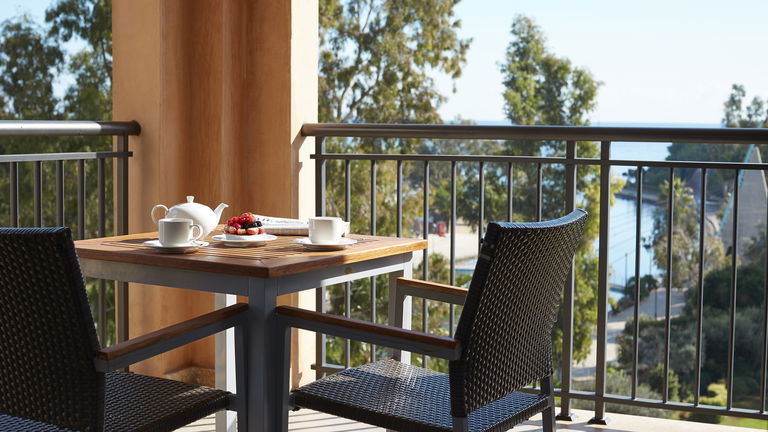 • Private balcony overlooking the sea with table and chairs on the lower floor of the Suite.
