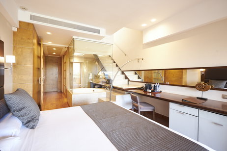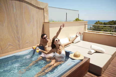 • 26 m² private solarium with magnificent views of the sea, a mini-hydromassage pool for two, outdoor shower, chill-out area with daybed and parasol on the upper floor of the suite.