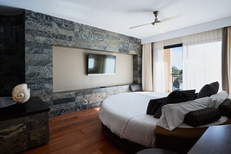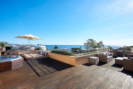 • Gran terraza privada con minipiscina de hidromasaje para dos personas, ducha exterior y zona chill-out con una gran daybed, sofá y parasol.
