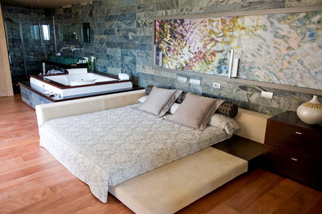• Dormitorio principal con cama king-size 2 x 2 m o cama redonda y TV pantalla plana de 50'.